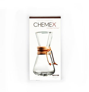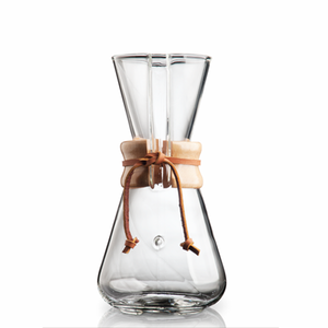 Invented by chemist Peter Schlumbohm to improve the standard drip-filter coffee of the time, Chemex coffeemakers entered the brewing world in the late 1940s. Each one is hand blown from heat-resistant Pyrex glass, and short of a drop kick or bar fight, they're indestructible. The conical shape of the top portion of the carafe, together with the unique Chemex paper filters, removes sediment, oils, and fats from your final cup so there is no bitterness, no grounds, just a perfect cup of coffee every single time. The narrow neck of the carafe fits your hand perfectly and protects it from the hot surface by a band of wood secured with a leather strap, and a subtle groove molded in the glass serves as a spout. Just remove the filter and grounds in one disposable package and your brewer becomes your carafe.