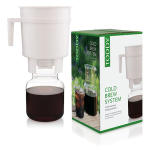 The Toddy Brew System produces 2L of delicious concentrated cold brew at a time. To brew, place the paper filter bag into the brewing container and pour 340g of coarsely ground coffee into the bag, followed by 2L of water. Steep for 12-24 hours to create a smooth, rich flavour. Afterwards, remove the stopper and let your coffee concentrate flow into the glass decanter. Coffee concentrate will stay fresh for up to two weeks in your refrigerator. For rich, smooth iced coffee, simply pour coffee concentrate and water, milk or soy over ice.
