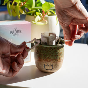 To brew, tear the top off the pouch, hook the arms over your cup and level the coffee inside.