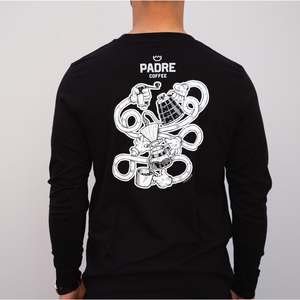 Our black and white design tees feature the whimsical and wonderfully detailed illustrative work of Phil Hollands (@thecafetracer), a Sunshine Coast-based Illustrator and regular at Padre Coffee Noosa.