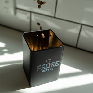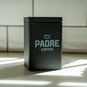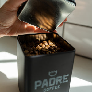 The perfect way to store your Padre Coffee beans is in a Padre Coffee tin. Easy to clean, light-excluding and completely air-tight, this classy tin will keep your coffee fresh and your waste to a minimum.